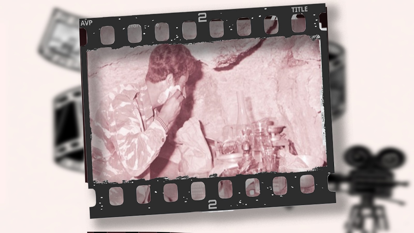 صورة لفدائي يحلق لحيته في معسكرات الثورة الفلسطينية في أحد معسكرات الثورة الفلسطينية